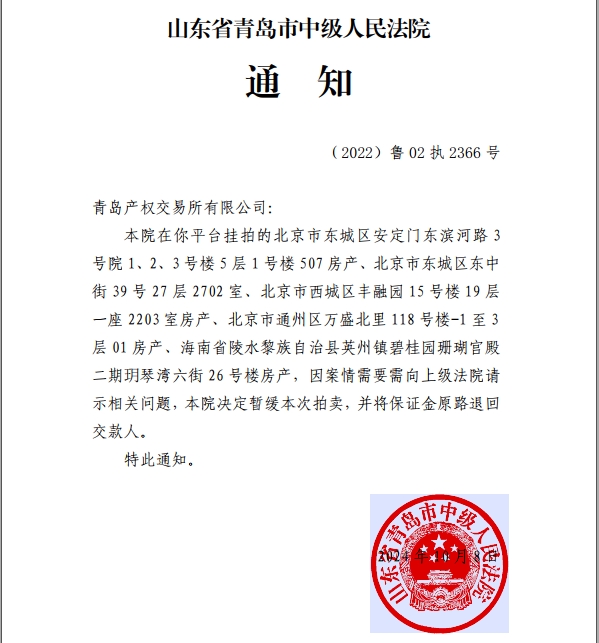 山東省青島市中級(jí)人民法院司法拍賣中止公告(2022)魯02執(zhí)2366號(hào)