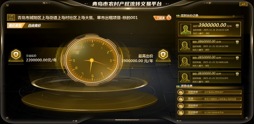 本次成交的上馬大集是青島現(xiàn)存最古老、規(guī)模最大的集市之一,歷史可追溯至清康熙年間,延續(xù)至今已超過(guò)三百年。220萬(wàn)元/年的起拍價(jià)吸引了6家意向方報(bào)名參與競(jìng)爭(zhēng),歷經(jīng)475輪激烈競(jìng)價(jià),最終以390萬(wàn)元/年的價(jià)格成交,溢價(jià)率高達(dá)77.2%。按照五年租期計(jì)算,該項(xiàng)目累計(jì)為社區(qū)集體經(jīng)濟(jì)增收超過(guò)880萬(wàn)元,成為農(nóng)村資源市場(chǎng)化配置的生動(dòng)實(shí)踐。