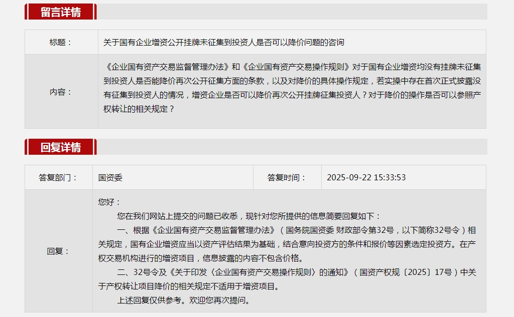 關(guān)于國有企業(yè)增資公開掛牌未征集到投資人是否可以降價問題的咨詢