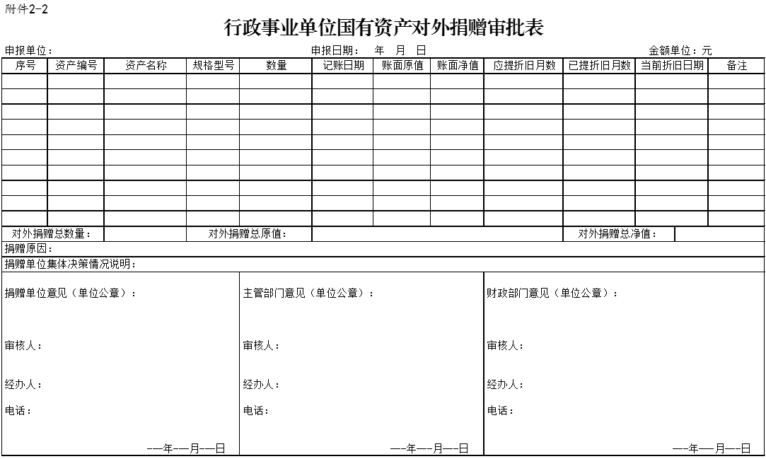 2.《行政事業(yè)單位國有資產(chǎn)對(duì)外捐贈(zèng)審批表》;